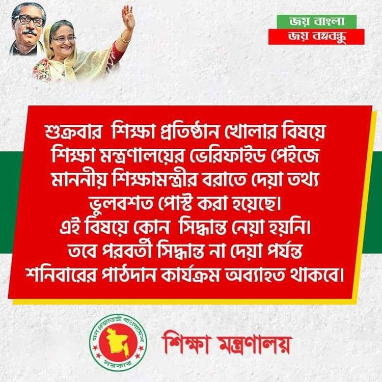 নতুন পোস্টে শিক্ষা মন্ত্রণালয় বলেছে, শুক্রবার শিক্ষা খোলার বিষয়ের শিক্ষা মন্ত্রণালয়ের ভেরিফায়েড পেজে শিক্ষামন্ত্রীর বরাতে দেওয়া তথ্য ভুলবশত পোস্ট করা হয়েছে। এই বিষয়ে কোনো সিদ্ধান্ত নেওয়া হয়নি। তবে পরবর্তী সিদ্ধান্ত না দেওয়া পর্যন্ত শনিবারের পাঠদান কার্যক্রম অব্যাহত থাকবে।