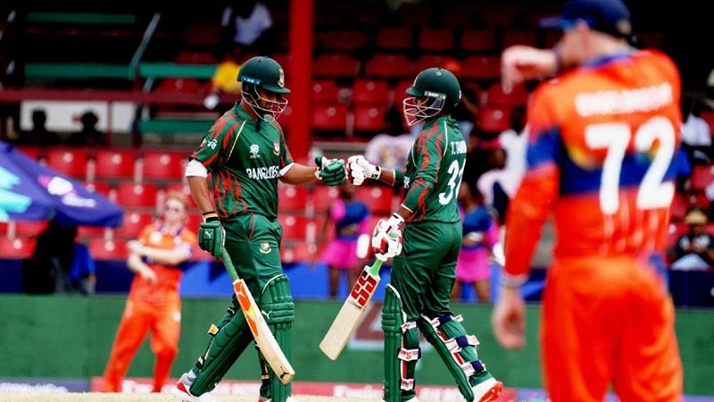 দুই অভিজ্ঞ ব্যাটার শুরুতেই ফিরলেও আজ দলের হাল ধরেন তানজিদ তামিম। এই তরুণ ওপেনারের সঙ্গে যোগ দেন সাকিব আল হাসান। তিনি এদিন শুরু থেকেই আক্রমণাত্মক খেলেছেন। তাদের দুজনের সাবলীল ব্যাটিংয়ে প্রথম পাওয়ার প্লেতে ২ উইকেট হারিয়ে ৫৪ রান তুলে বাংলাদেশ।