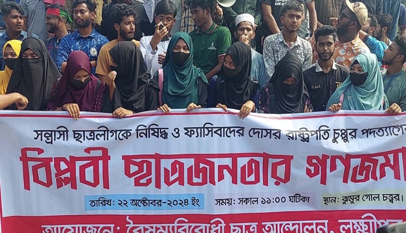 এবার রাষ্ট্রপতির পদত্যাগ ও আওয়ামী লীগের অঙ্গ সংগঠন ছাত্রলীগকে নিষিদ্ধের দাবিতে লক্ষ্মীপুরে বিক্ষোভ মিছিল করেছেন শিক্ষার্থীরা। মঙ্গলবার (২২ অক্টোবর) বেলা ১১টার দিকে শহরের ঝুমুর এলাকায় বৈষম্যবিরোধী ছাত্র আন্দোলনের ব্যানারে ঘণ্টাব্যাপী এই বিক্ষোভ মিছিল অনুষ্ঠিত হয়।