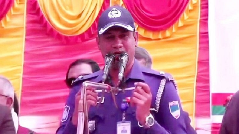 এরপর তাকে বলতে শোনা যায়, ‘এ প্রোগ্রামটা আপনাদেরই। আমি কেন পুলিশ আসবো। তারপরও আমি আসলাম। আমার থানার সামনে, আসতে হবে। মনও চাই আসতে। মনেরও টান দেয় যে এখানে একটু কথা বলি। আসলে সব সময়তো সব কথা বলা যায় না। আমি আপনাদের কাছে বিনীত অনুরোধ করছি, কেউ কোনো ঝামেলা করবেন না। আমরা আপনাদের সেবায় এখানে আছি। যতটুকু পারি আমাদের পক্ষ থেকে আইন-শৃঙ্খলা নিয়ন্ত্রণের চেষ্টা করবো। সব হিংসা-বিদ্বেষ ভুলে যান। আপনাদের মধ্যে যদি হিংসা থাকে তাহলে তৃতীয় পক্ষ সুযোগ নেবে। এই সুযোগ আর দেওয়া যাবে না।’