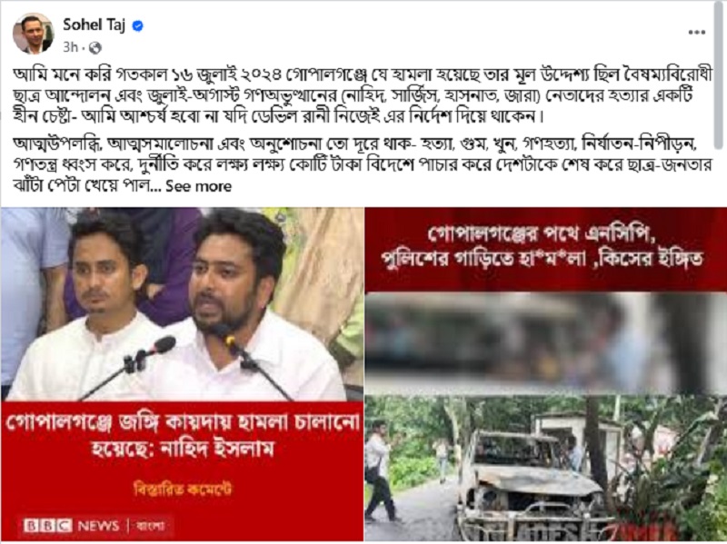 পোস্টে সোহেল তাজ লিখেছেন, ‘আমি মনে করি গতকাল ১৬ জুলাই ২০২৪ গোপালগঞ্জে যে হামলা হয়েছে তার মূল উদ্দেশ্য ছিল বৈষম্যবিরোধী ছাত্র আন্দোলন এবং জুলাই-অগাস্ট গণঅভুত্থানের (নাহিদ, সার্জিস, হাসনাত, জারা) নেতাদের হত্যার একটি হীন চেষ্টা- আমি আশ্চর্য হবো না যদি ডেভিল রানী নিজেই এর নির্দেশ দিয়ে থাকেন।’