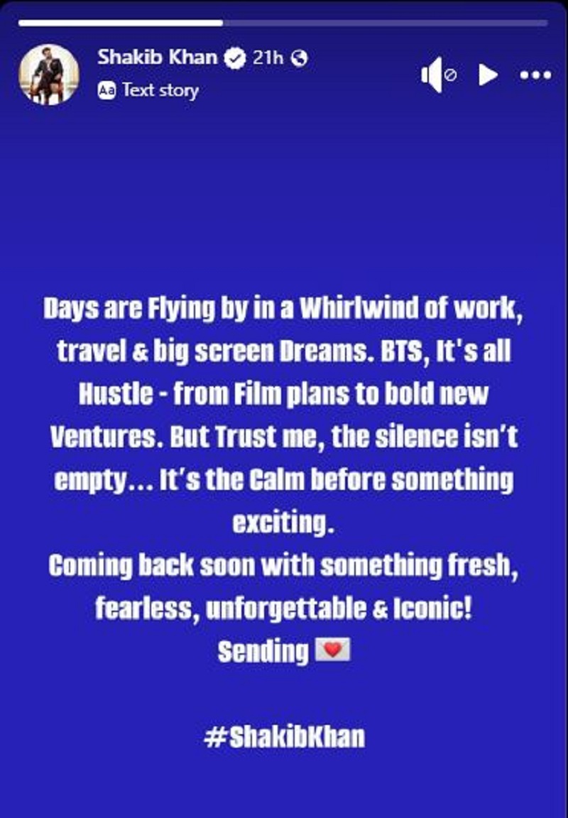 শুক্রবার (৮ আগস্ট) তার ফেসবুক পেজের একটি স্টোরিতে শাকিব খান লিখেছেন, ‘বড় পর্দার জন্য বড় বড় স্বপ্ন নিয়ে দিনের পর দিন ছুটোছুটি চলছে। এই সময়ের নীরবতা মানে কোনো শূন্যতা নয়; বরং এটি এমন একটি মুহূর্ত যা চুপচাপ রয়েছে বড় কিছু ঘটার অপেক্ষায়।’