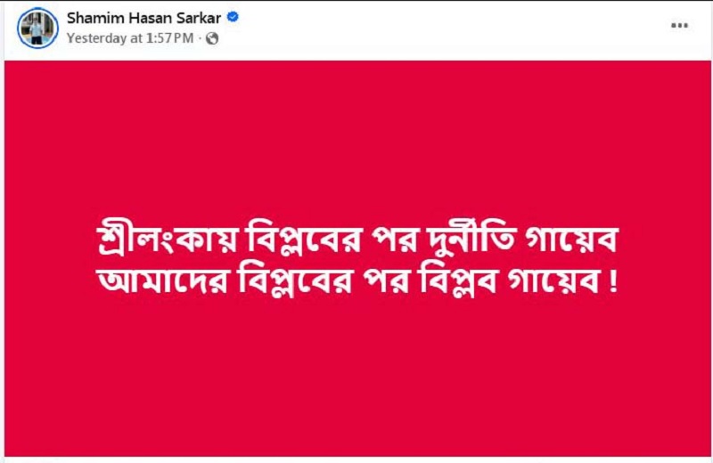 এবার সোশ্যাল মিডিয়ায় বেশ সক্রিয় জনপ্রিয় কনটেন্ট ক্রিয়েটর ও ছোটপর্দার আলোচিত অভিনেতা শামীম হাসান সরকার। সেখানে নিজের কাজের পাশাপাশি মাঝে মধ্যেই সমসাময়িক ইস্যু নিয়ে কথা বলতে দেখা যায় তাকে। সেই ধারাবাহিকতায় এবার দেশের দুর্নীতি নিয়ে কথা বললেন এ অভিনেতা। মঙ্গলবার (১২ জুলাই) ফেসবুক ভেরিফায়েড পেজে একটি পোস্ট দেন শামীম হাসান সরকার। সেখানে তিনি লেখেন, ‘শ্রীলঙ্কায় বিপ্লবের পর দুর্নীতি গায়েব। আমাদের বিপ্লবের পর বিপ্লব গায়েব!’