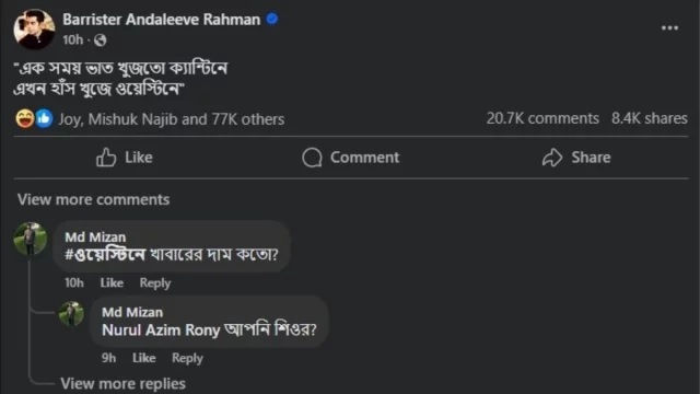 এই রিপোর্ট লেখার সময় পর্যন্ত আন্দালিব রহমান পার্থের এই পোস্টে লাইক পড়েছে ৭৭ হাজার। ব্যারিস্টার আন্দালিব রহমান পার্থর এই পোস্টে পক্ষে বিপক্ষে ২০ হাজার ৫শ মানুষ মন্তব্য করেছেন এবং এটি শেয়ার হয়েছে আট হাজারের বেশি বার।