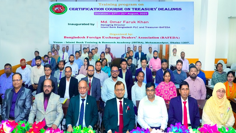 বাংলাদেশ ফরেন এক্সচেঞ্জ ডিলার্স অ্যাসোসিয়েশন (বাফেডা)-এর উদ্যোগে পাঁচ দিন ব্যাপী ‘সার্টিফিকেশন কোর্স অন ট্রেজারি ডিলিংস’ শীর্ষক প্রশিক্ষণ কর্মশালা ১৭ আগস্ট ২০২৫, রবিবার ইসলামী ব্যাংক ট্রেইনিং অ্যান্ড রিসার্চ একাডেমিতে (আইবিটিআরএ) উদ্বোধন করা হয়। ইসলামী ব্যাংক বাংলাদেশ পিএলসি’র ম্যানেজিং ডাইরেক্টর ও বাফেডা’র ট্রেজারার মোঃ ওমর ফারুক খাঁন প্রধান অতিথি হিসেবে এ কর্মশালা উদ্বোধন করেন।