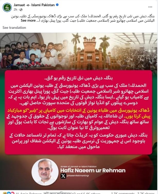 ঢাকা বিশ্ববিদ্যালয়ের কেন্দ্রীয় ছাত্র সংসদ (ডাকসু) ও হল সংসদ নির্বাচনে বাংলাদেশ ইসলামী ছাত্রশিবির সমর্থিত ঐক্যবদ্ধ শিক্ষার্থী জোট প্যানেল নিরঙ্কুশ বিজয়ী হওয়ায় উচ্ছ্বাস প্রকাশ করেছিল পাকিস্তান জামায়াতে ইসলামী। একইসঙ্গে বাংলাদেশের ইতিহাসে প্রথমবারের মতো ছাত্রশিবিরের এমন জয়ে শুভেচ্ছা জানিয়ে নিজস্ব অফিসিয়াল ফেসবুক পেজে পোস্টও দিয়েছিল দলটি। তবে, কয়েক ঘণ্টার ব্যবধানে সেই পোস্ট আবার সরিয়ে নিয়েছে তারা।