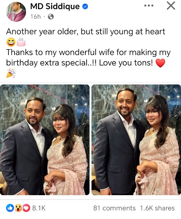 এদিকে সিদ্দিকও নিজের ফেসবুকে দুজনের ছবি প্রকাশ করে স্ত্রীর প্রতি কৃতজ্ঞতা জানিয়েছেন। রোববার দিবাগত (১৩ অক্টোবর) রাতে সিদ্দিক তার ফেসবুকে ছবি শেয়ার করে লেখেন, ‘আরো একটি বছর পেরিয়ে গেল, কিন্তু মনটা এখনো তরুণ। আমার জন্মদিনকে বিশেষ করে তোলার জন্য আমার প্রিয় স্ত্রীকে অসংখ্য ধন্যবাদ। তোমায় অনেক ভালোবাসি।’