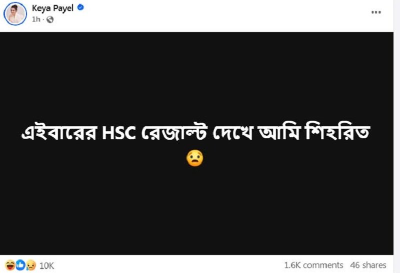 এদিকে এদিন পরীক্ষার ফলাফল প্রকাশের এ পরিসংখ্যান চোখে পড়তেই চমকে গেছেন অনেকে। তাদেরই একজন ছোটপর্দার জনপ্রিয় অভিনেত্রী কেয়া পায়েল। ফলাফল প্রকাশের পর তাৎক্ষণিক সোশ্যাল মিডিয়া ফেসবুক ভেরিফায়েড পেজে প্রতিক্রিয়া জানিয়েছেন তিনি। সেখানে তিনি লিখেছেন, ‘এইবারের এইচএসসির রেজাল্ট দেখে আমি শিহরিত।’