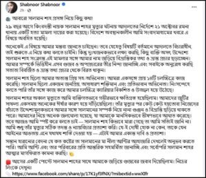 তিনি লিখেছেন, ‘অনেকেই এ বিষয়ে আমার মন্তব্য জানতে চাইছেন। তবে যেহেতু বিষয়টি বর্তমানে আদালতে বিচারাধীন, তাই শুরুতে এ নিয়ে কথা বলতে চাইনি। কিন্তু দুঃখজনকভাবে লক্ষ্য করছি, কিছু ব্যক্তি অসৎ উদ্দেশ্যে সালমান শাহ সংক্রান্ত এই মামলার সঙ্গে আমার নাম জড়িয়ে বিভ্রান্তিকর তথ্য ও ভ্রান্ত প্রচার ছড়াচ্ছেন। আমার সম্পর্কে ভিত্তিহীন এসব গুজব ও অপপ্রচারের তীব্র নিন্দা জানাচ্ছি এবং সবাইকে অনুরোধ করছি, সত্যতা বিবর্জিত ও ভ্রান্ত তথ্য প্রচার থেকে বিরত থাকুন।’