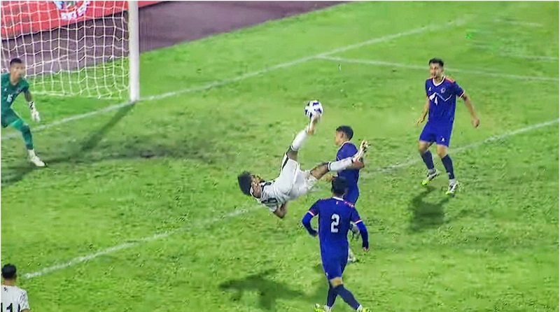 নেপালের ডিফেন্ডার ক্লিয়ার করলেও অধিনায়ক জামালের পায়ে পড়ে। তিনি বলটি হালকা উঠিয়ে হামজার উদ্দেশ্যে পাঠান। হামজা বক্সের মধ্যে শূন্যে লাফিয়ে শট নেন।