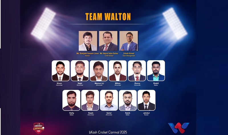 টিম অ্যাডভাইজার শাহজালাল হোসেন লিমন বলেন, ওয়ালটন একটি ক্রীড়াবান্ধব প্রতিষ্ঠান। শুরু থেকে দেশ-বিদেশের বিভিন্ন খেলাধুলায় পৃষ্ঠপোষকতা করে আসছে ওয়ালটন। পাশাপাশি ওয়ালটনের এমপ্লয়ীদের নিয়ে গঠিত করপোরেট টিম ফুটবল, ক্রিকেটসহ বিভিন্ন খেলাধুলায় অংশ নিয়ে দারুণ সাফল্য বয়ে আনছে। এরই ধারাবাহিকতায় ‘’বিকাশ ক্রিকেট কার্নিভাল ২০২৫’ এ অংশ নিচ্ছি আমরা।