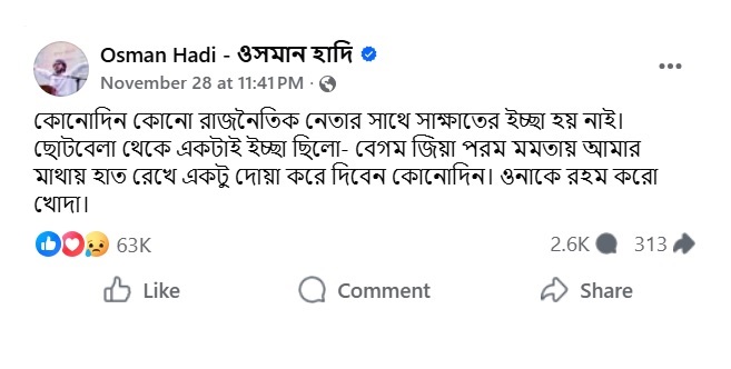 গত ২৮ নভেম্বর অসুস্থ বেগম খালেদা জিয়াকে নিয়ে নিজের ইচ্ছার কথা জানিয়ে একটি স্ট্যাটাস দেন ওসমান হাদি। সেখানে তিনি লেখেন, কোনোদিন কোনো রাজনৈতিক নেতার সাথে সাক্ষাতের ইচ্ছা হয় নাই। ছোটবেলা থেকে একটাই ইচ্ছা ছিলো- বেগম জিয়া পরম মমতায় আমার মাথায় হাত রেখে একটু দোয়া করে দিবেন কোনোদিন। ওনাকে রহম করো খোদা।