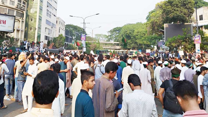 তাদের হাতে পতাকা, মুখে স্লোগান। ফ্যাসিবাদের কালো হাত ভেঙে দাও গুঁড়িয়ে দাও, আওয়ামী লীগের আস্তানা এই বাংলায় হবে না, হাদি ভাইয়ের রক্ত বৃথা যেতে দেব না, স্লোগান দিচ্ছেন বিক্ষুদ্ধ ছাত্র-জনতা।