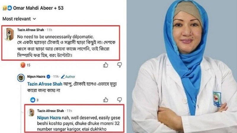 সেই স্ট্যাটাসে গিয়ে তাজিন আফরোজ শাহ কমেন্টসে মন্তব্য করেন, ‘নো নীড টু বি আন নেসেসারিলি ডিপ্লোমেটিক’, সে একটা ছ্যাঁচড়া টোকাই ও সন্ত্রাসী ছাড়া কিছুই না। দেশকে ধ্বংস করা ছাড়া আর কোনো কাজে লাগেনি, তাই জিরো সিম্প্যাথি ফর হিম, বরং উল্টোটা।’