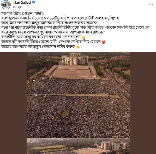 হাদির দাফন সম্পন্ন হওয়ার পর সামাজিক যোগাযোগমাধ্যমে আবেগঘন একটি পোস্ট দেন ছোট পর্দার জনপ্রিয় অভিনেতা ইরফান সাজ্জাদ। ফেসবুকে তিনি লেখেন, আপনি জিতে গেছেন হাদি। বলেছিলেন, সংসদ নির্বাচনে ৫০০ ভোটও যদি পান, সেটাই আলহামদুলিল্লাহ। আর আজ লক্ষ লক্ষ মানুষ আপনাকে নিয়ে সংসদ ভবনের সামনে।