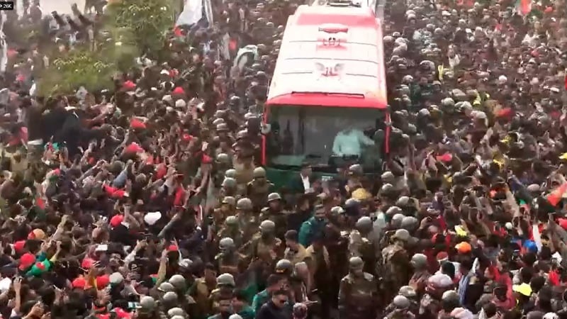 হযরত শাহজালাল আন্তর্জাতিক বিমানবন্দর থেকে বের হয়ে পূর্বাচলের ৩০০ ফিটের সংবর্ধনা মঞ্চের পথে বিএনপির ভারপ্রাপ্ত চেয়ারম্যান তারেক রহমানের গাড়ি বহর। বৃহস্পতিবার (২৫ ডিসেম্বর) দুপুর ১টা ২২ মিনিটে তার গাড়ি বহর বিমানবন্দরের কাছে কাওলা বাস স্ট্যান্ড এলাকা পার হয়ে ৩০০ ফিটের সেই সুবিশাল মঞ্চের দিকে আগাচ্ছে।