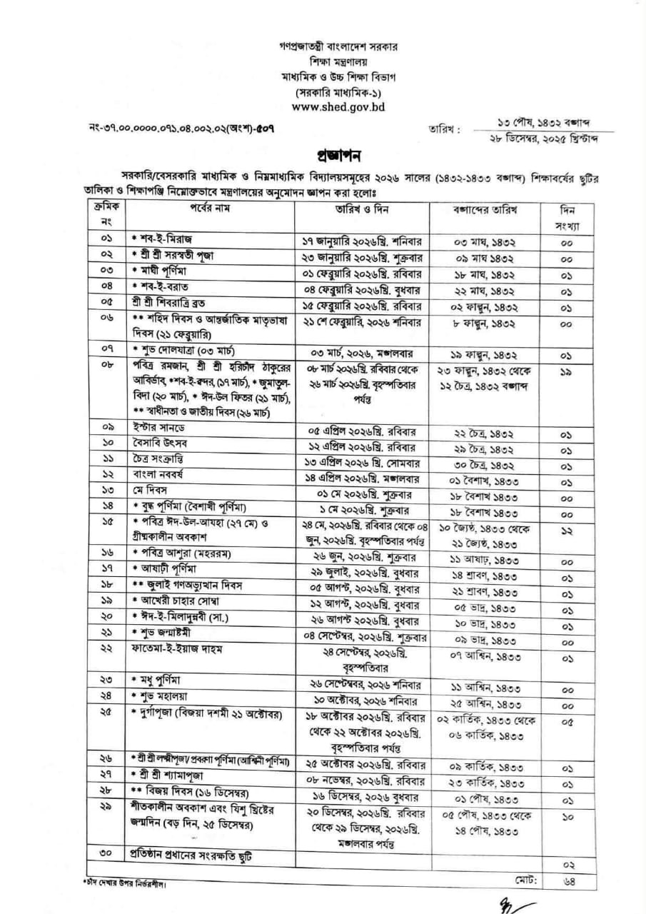 সরকারি-বেসরকারি মাধ্যমিক ও নিম্ন মাধ্যমিক বিদ্যালয়ের ২০২৬ শিক্ষাবর্ষের ছুটির তালিকা প্রকাশ করেছে শিক্ষা মন্ত্রণালয়। এতে ছুটি রাখা হয়েছে ৬৪ দিন, যা গত বছর ছিল ৭৬ দিন। সেই হিসাবে এবার ছুটি কমেছে ১২ দিন। রোববার (২৮ ডিসেম্বর) শিক্ষা মন্ত্রণালয়ের মাধ্যমিক ও উচ্চ শিক্ষা বিভাগ থেকে এক প্রজ্ঞাপনে ছুটির তালিকা ও শিক্ষাপঞ্জি প্রকাশ করা হয়।