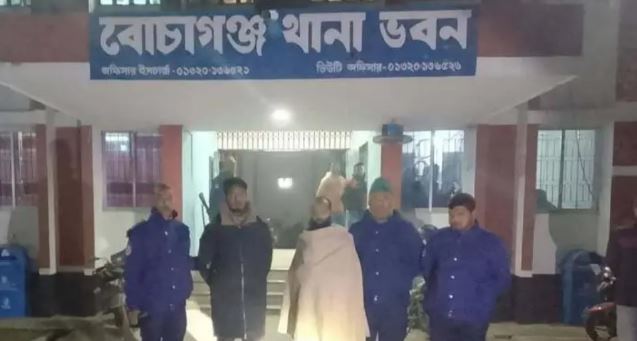 এসময় পরিবারের লোকজনদের বিভিন্ন প্রকারের ভয়ভীতি ও হুমকি দেখিয়ে ২ লাখ টাকা চাঁদা দাবি করেন। পরে পরিবারের লোকজনের চিৎকারে স্থানীয়রা এগিয়ে এসে তাদেরকে আটক করে। এসময় তার অন্যান্য সঙ্গীরা পালিয়ে যান। স্থানীয়রা আটক ২ জনকে বোচাগঞ্জ থানা পুলিশের কাছে সোপর্দ করেন। এদিকে বোচাগঞ্জ থানার ভারপ্রাপ্ত কর্মকর্তা মো. মিজানুর রহমান জানান, রাতে তাদেরকে স্থানীয়রা থানায় সোপর্দ করেছে। এই ঘটনায় একটি এজাহার দায়ের করা হয়েছে। তাদের কাছ থেকে মোটরসাইকেল, লোহার পাইপ, স্টিলের তৈরি লাঠি, ভিডিও রেকর্ডিংয়ের ছোট ক্যামেরাসহ অন্যান্য মালামাল জব্দ করা হয়েছে। তাদেরকে আদালতে সোপর্দ করা হয়েছে।