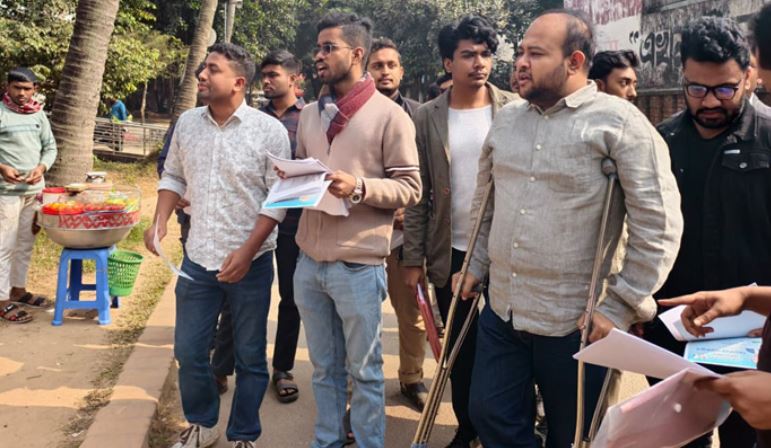 এবার ঢাকা বিশ্ববিদ্যালয়ের শিক্ষার্থীদের মাঝে দিনভর তারেক রহমান প্রণীত দেশগড়ার পরিকল্পনার লিফলেট প্রচার করেছেন ডাকসুতে ছাত্রদল থেকে জিএস পদে প্রার্থীতা করা তানভীর বারী হামিম। রবিবার (১১ জানুয়ারি) ছাত্রদল নেতাকর্মীদের সাথে নিয়ে ক্রাচে ভর দিয়েই তিনি এ প্রচারণা চালান।