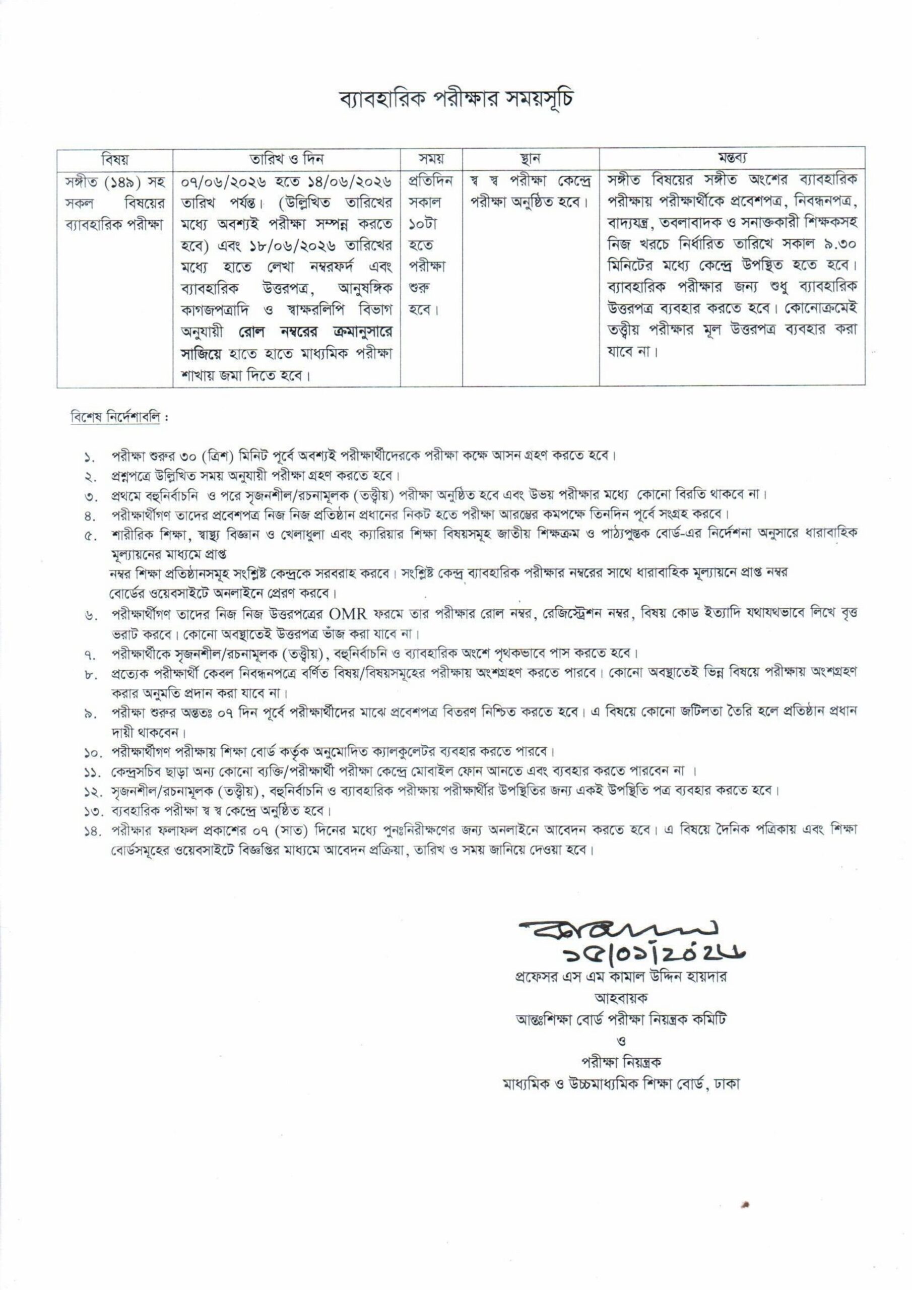 রুটিনে বলা হয়েছে, ৭ থেকে ১৪ জুন পর্যন্ত ব্যবহারিক পরীক্ষা অনুষ্ঠিত হবে। ১৮ জুনের মধ্যে হাতে লেখা নম্বরফর্দ এবং ব্যবহারিক উত্তরপত্র, আনুষঙ্গিক কাগজপত্র ও স্বাক্ষরলিপি বিভাগ অনুযায়ী রোল নম্বরের ক্রমানুসারে সাজিয়ে হাতে হাতে মাধ্যমিক পরীক্ষা শাখায় জমা দিতে হবে।