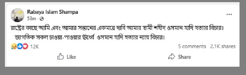 ওই পোস্টে তিনি লিখেছেন, ‘রাষ্ট্রের কাছে আমি এবং আমার সন্তানের একমাত্র দাবি—আমার স্বামী শহীদ ওসমান হাদি হত্যার বিচার।’