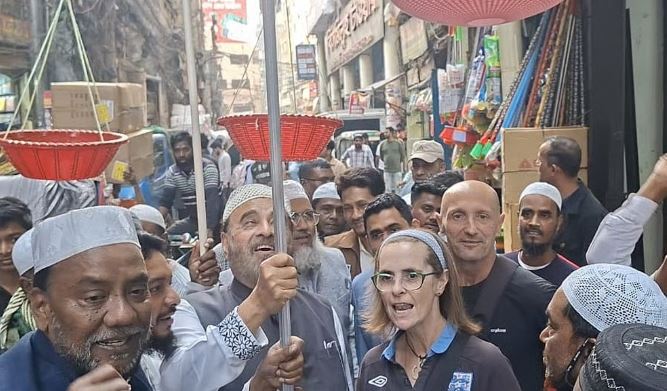এবার রাজধানীর পুরান ঢাকার মিটফোর্ড এলাকায় সোমবার (২৬ জানুয়ারি) বিকেলে নির্বাচনী গণসংযোগে ব্যস্ত ছিলেন ঢাকা–৭ আসনে জামায়াতে ইসলামীর প্রার্থী মো. এনায়াত উল্লা। বিকেল চারটার দিকে শুরু হওয়া এই কর্মসূচিতে তার সঙ্গে থাকা নেতা-কর্মীরা দলটির প্রতীক দাঁড়িপাল্লা হাতে নিয়ে স্লোগান দিচ্ছিলেন। এ সময় হঠাৎ করেই সেই স্লোগানে কিছুক্ষণের জন্য কণ্ঠ মেলান দুই বিদেশি নাগরিক। যাদের একজন নারী ও অন্যজন পুরুষ।