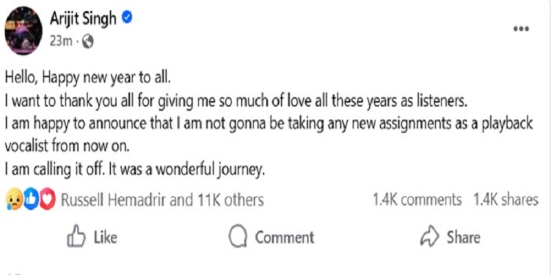 তবে সংগীত অনুরাগীদের জন্য এবার বড় এক দুঃসংবাদ দিলেন ভারতের জনপ্রিয় কণ্ঠশিল্পী অরিজিৎ সিং। আর কোনো নতুন সিনেমার গানে (প্লেব্যাক) কণ্ঠ দেবেন না বলে ঘোষণা দিয়েছেন তিনি।