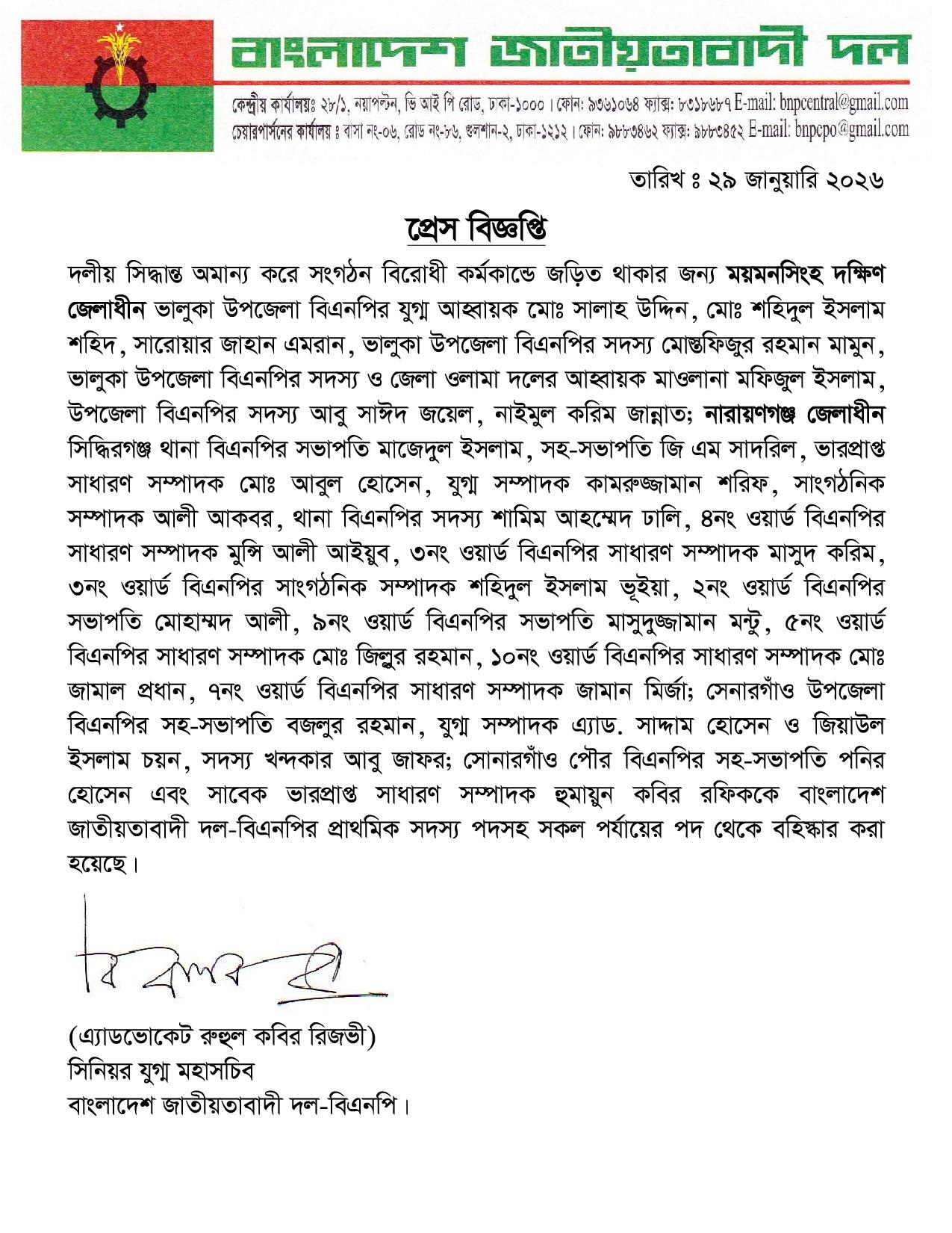 দলীয় সিদ্ধান্ত অমান্য ও সংগঠনবিরোধী কর্মকাণ্ডে জড়িত থাকার অভিযোগে বাংলাদেশ জাতীয়তাবাদী দল (বিএনপি) ময়মনসিংহ, নারায়ণগঞ্জের বিভিন্ন উপজেলা ও ওয়ার্ডের ২৭ নেতা-কর্মীকে বহিষ্কার করেছে। বৃহস্পতিবার (২৯ জানুয়ারি) বিএনপির সিনিয়র যুগ্ম মহাসচিব অ্যাডভোকেট রুহুল কবির রিজভী স্বাক্ষরিত এক প্রেস বিজ্ঞপ্তির মাধ্যমে এ সিদ্ধান্তের কথা জানানো হয়।