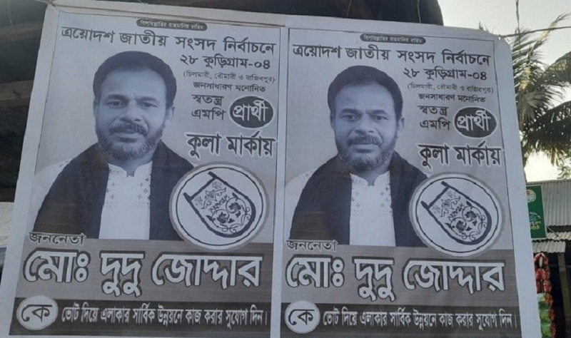 এবারের ত্রয়োদশ জাতীয় সংসদ নির্বাচনের ‘প্রার্থী’ মো. দুদু জোদ্দার। মোড়ে মোড়ে টাঙানো হয়েছে পোস্টার। আর সেই পোস্টারে দেওয়া তথ্য অনুযায়ী, তিনি এবারের নির্বাচনে কুলা মার্কায় ভোট করবেন। কুড়িগ্রাম-৪ আসনে স্বতন্ত্র প্রার্থী তিনি। অনুসন্ধানে জানা গেছে, এবারের নির্বাচনে তিনি ‘ভুয়া প্রার্থী’। কুড়িগ্রাম-৪ (চিলমারী, রৌমারী ও রাজিবপুর) সংসদীয় আসনে দুদু জোদ্দার নামের কোনো প্রার্থীর বৈধতা নেই।