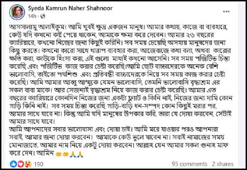 এদিকে নিজের শারীরিক অসুস্থতার কথা জানিয়ে ফেসবুকে একটি দীর্ঘ স্ট্যাটাস দিয়েছেন শাহনূর। সেখানে তিনি লিখেছেন, ‘আমি খুবই ক্ষুদ্র একজন মানুষ। আমার কথায়, কাজে বা ব্যবহারে কেউ যদি কখনো কষ্ট পেয়ে থাকেন, আমাকে ক্ষমা করে দেবেন। আমার ২৬ বছরের ক্যারিয়ারে কখনো নিজের জন্য কিছুই করিনি। সবসময় চেয়েছি অসহায় মানুষদের জন্য কিছু করতে। কখনো কারো সঙ্গে খারাপ ব্যবহার করা, আজেবাজে কথা বলা অথবা কারোর ক্ষতি করা, কাউকে হিংসা করা―এগুলো মাথাই কখনো আসেনি। সবসময় পজিটিভ চিন্তা করেছি এবং পজিটিভ কাজ করার চেষ্টা করেছি।’