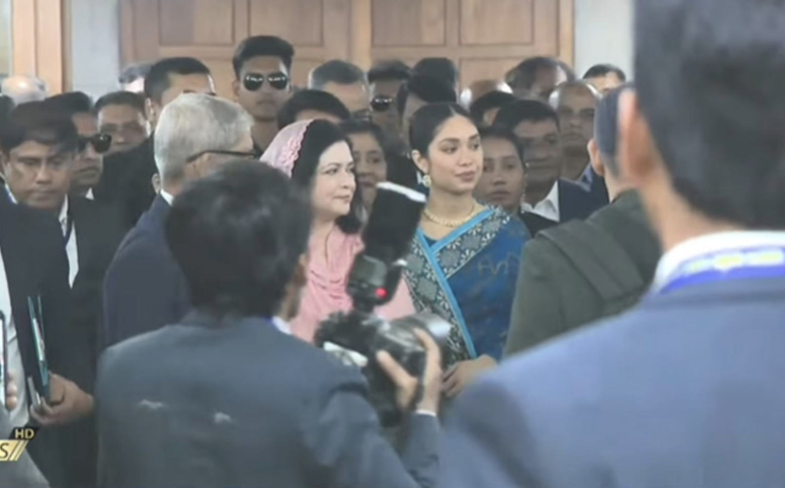 এবার বিএনপি চেয়ারম্যান তারেক রহমানের সংসদ সদস্য হিসেবে শপথগ্রহণ অনুষ্ঠানে যোগ দিয়েছে তার স্ত্রী জুবাইদা রহমান ও মেয়ে জাইমা রহমান। জুবাইদা হালকা গোলাপি রঙের সালোয়ার-কামিজ পরে এসেছেন। আর জাইমার পরনে নীল শাড়ি।