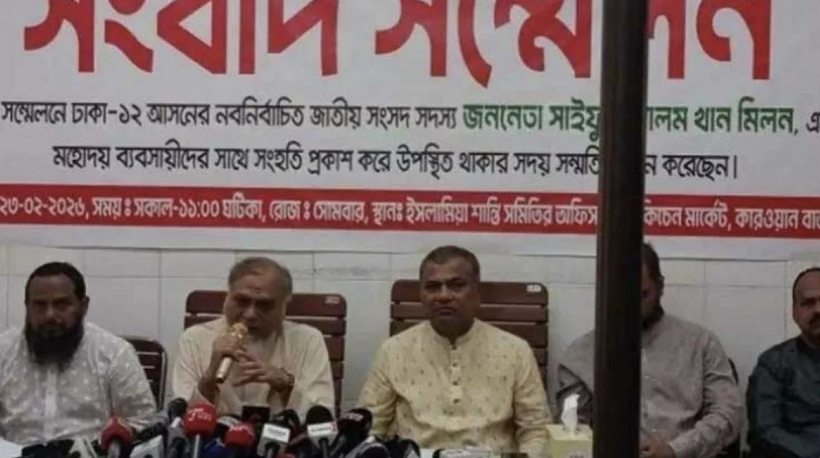 এবার রাজধানীর কারওয়ান বাজারে চাঁদাবাজি বন্ধ করা অনেক কঠিন বলে মন্তব্য করেছেন ঢাকা-১২ আসনের জামায়াত ইসলামী থেকে নবনির্বাচিত সংসদ সদস্য সাইফুল আলম মিলন। সোমবার (২৩ ফেব্রুয়ারি) দুপুরে কারওয়ান বাজারের কিচেন মার্কেটে ইসলামিয়া শান্তি সমিতির আয়োজনে এক সংবাদ সম্মেলনে তিনি এ কথা বলেন। রমজান উপলক্ষে দ্রব্যমূল্য নিয়ন্ত্রণ, ব্যবসায়ীদের কাছে চাঁদাবাজি, ভয়ভীতি ও হয়রানির প্রতিবাদে এই সংবাদ সম্মেলন আয়োজন করা হয়।