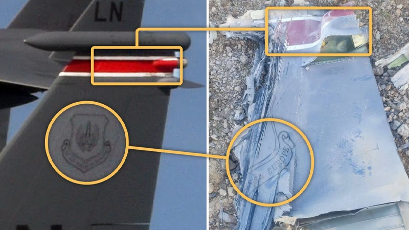 সিএনএন বলছে, ছবিতে “US Air Forces in Europe”–এর আংশিক লোগো দেখা গেছে, যা সাধারণত এফ-১৫ বিমানের লেজের অংশে থাকে। এছাড়া লাল-সাদা ডোরাকাটা চিহ্নও দেখা যায়, যা ওই বিমানের লেজের উপরের অংশের বৈশিষ্ট্য।