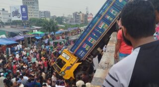 নিয়ন্ত্রণ হারিয়ে ফ্লাইওভারে ঝুলে রইল ট্রাক